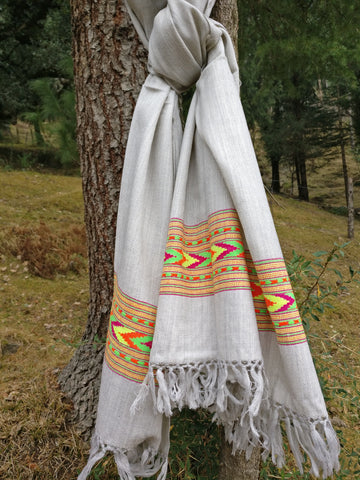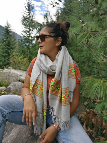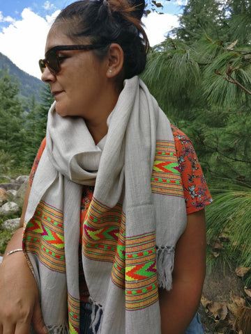 Handloomed to perfection using traditional methods,with a vibrant cashmilon tribal pattern.This scarf is for women as well as men. Large in size, it can be used as a light blanket, neck scarf , shawl or wear it the way you want.